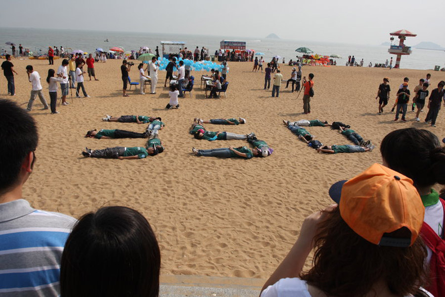 2009年10月24日,當日是350全球應對氣候變化行動日,世界各地的民眾紛紛用自己的方式來表示對全球氣候變化的關注和擔憂。圖為中國廣東珠海海濱泳場,大學生進行海灘辦公的行為藝術。鐘凡 攝