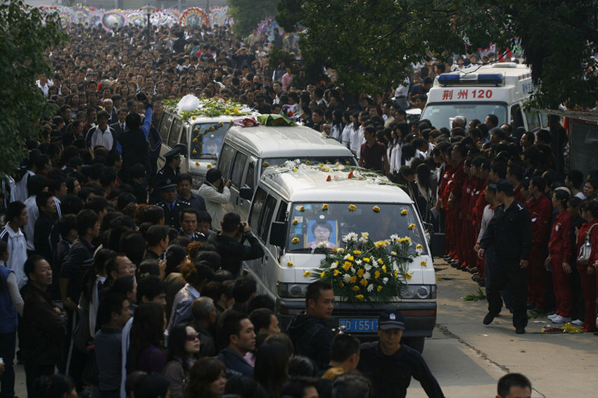 10月28日上午,湖北荊州市在市殯儀館舉行隆重追悼大會,悼念陳及時、何東旭、方招三位舍己救人大學生。數(shù)萬群眾趕到追悼會現(xiàn)場,手捧菊花為英雄道別。