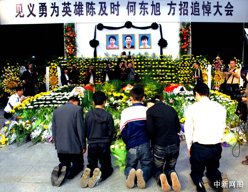 跪拜三位英雄大學生。曾尉 攝