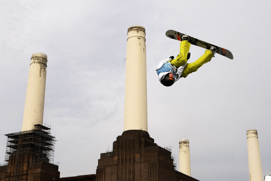 周五(30日),英國一位滑雪板高手在倫敦的一個電站前參加世界杯滑雪板比賽。 來源:中國新聞網(wǎng)