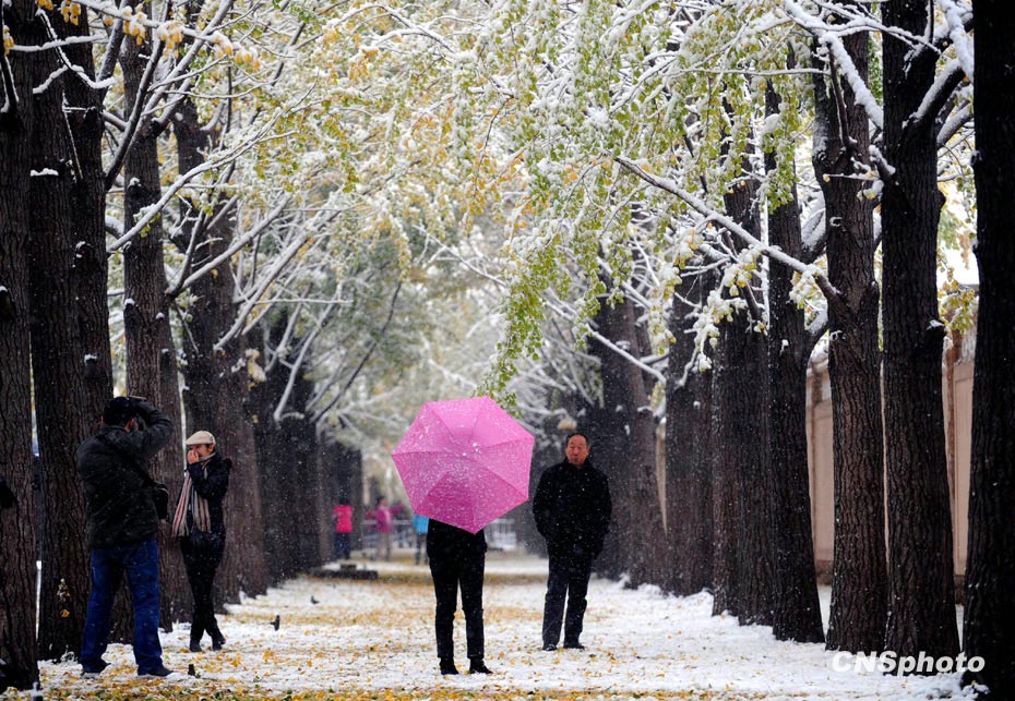 11月1日,深秋的北京大雪紛飛銀裝素裹,市民在銀杏樹林觀賞黃葉披上銀裝。北京今年的初雪時間提前了整整一個月。中新社發 廖攀 攝