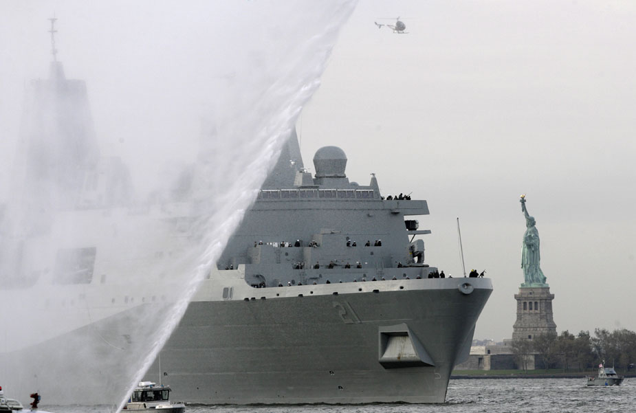 周一(2日),由紐約世界貿易中心廢鋼建成的美國軍艦駛過自由女神像。來源:中國新聞網