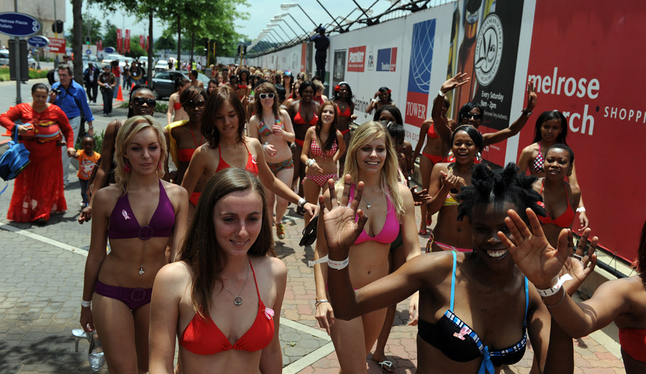 11月7日,南非的約翰內斯堡正值夏天,將近300位身穿比基尼泳裝的女郎齊聚游行。希望借此打破最大規模比基尼游行吉尼斯紀錄。