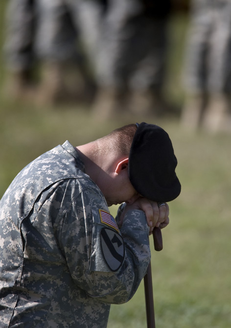 2009年11月10日,在美國得克薩斯州胡德堡陸軍基地,士兵在悼念儀式上哭泣。當日,美國德克薩斯州胡德堡陸軍基地舉行儀式悼念槍擊案遇難者。 圖片來源:中國新聞網