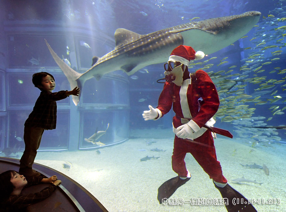 11月19日,一名裝扮成圣誕老人的潛水員在日本大阪水旅館的水族箱內歡迎游客光臨。這是該水族館為了迎接每年一度的圣誕節而搞的活動。圖片來源:中國新聞網>>點擊觀看詳細內容