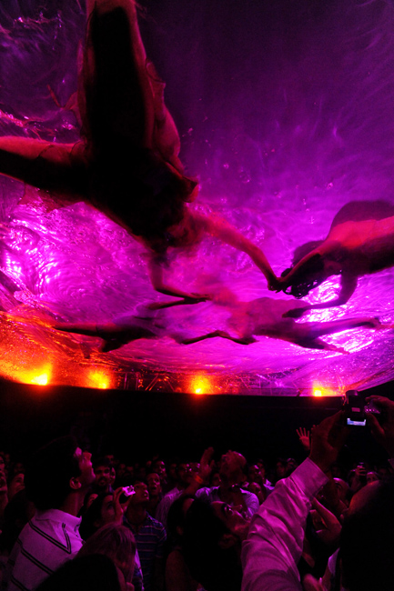 近日,阿根廷演員在加拉加斯舉行了一場名為“蠻力”水下演出,光怪陸離的燈光配合水中的演出吸引了大量觀眾到場觀看。圖片來源:中國新聞網(wǎng)