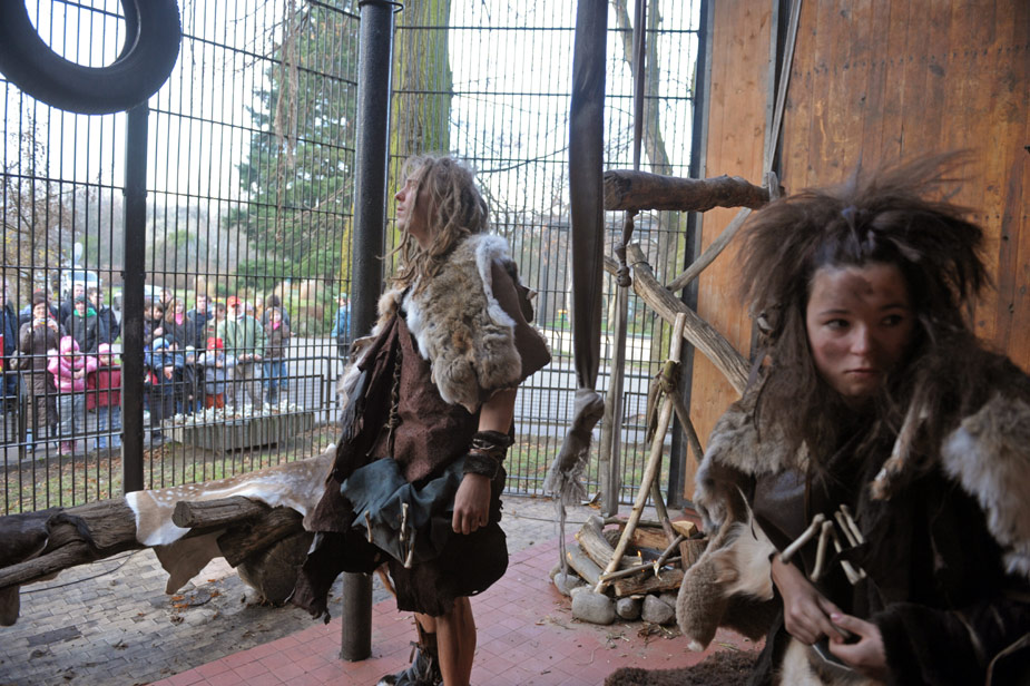 11月27日,波蘭首都華沙動物園里,一男一女兩個志愿者扮成原始洞穴人向參觀者進行展示。圖片來源:中國新聞網