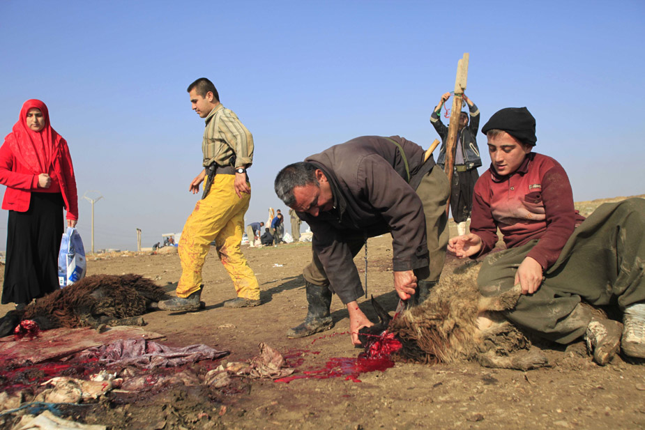 11月28日,世界各國的穆斯林迎來傳統節日“宰牲節”。圖為伊拉克的穆斯林在宰牲節上宰殺牲畜。