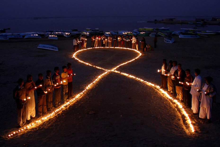 11月30日,印度那薩羅瓦,數(shù)十名村民在海灘上用油燈組成象征艾滋病防治的紅絲帶迎接世界艾滋病日。12月1日是世界艾滋病日,2009年世界艾滋病日的主題是“普遍可及和人權(quán)”。世界各地民眾組織各種活動(dòng)呼吁人們關(guān)注艾滋病。圖片來源:中國新聞網(wǎng)