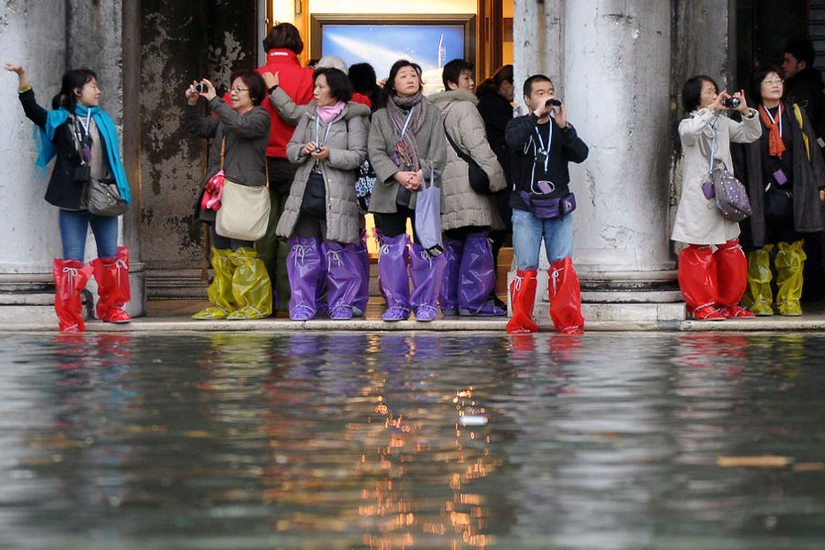 圖為一群游客穿著雨靴在被水淹沒的圣馬可廣場上拍照。