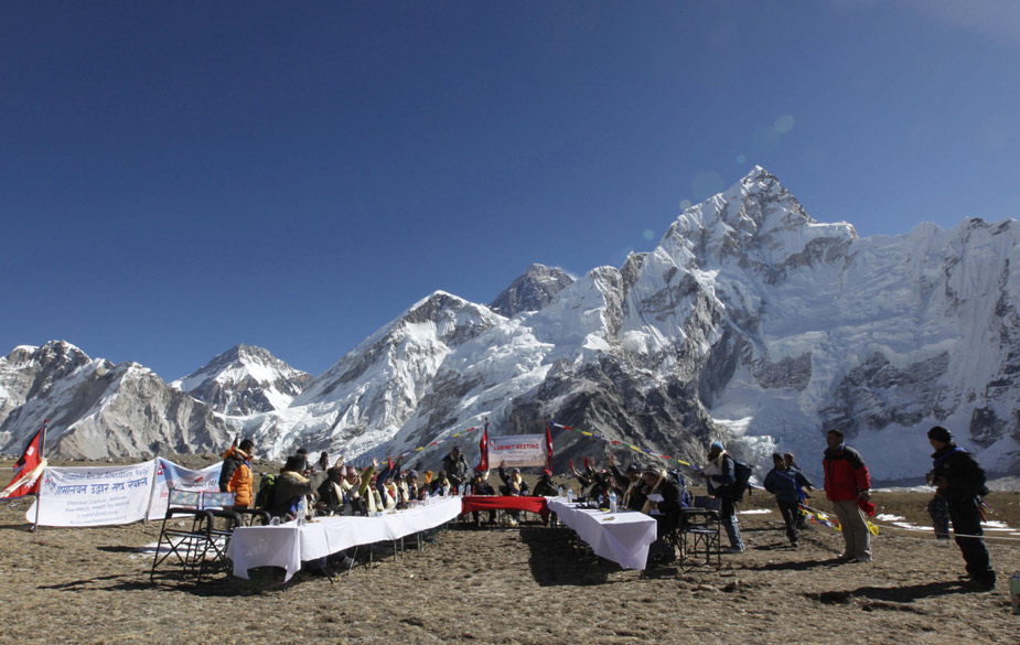 12月4日,尼泊爾總理和22位部長在喜馬拉雅山海拔5262米的高度舉行內閣會議,討論全球變暖對喜馬拉雅山的影響。呼吁人們切實采取行動,保護環境。