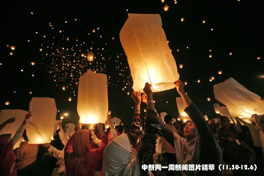12月5日,在印度尼西亞首都雅加達,人們將孔明燈升上天空。當晚有數千人參加放燈活動,試圖打破“數量最多的孔明燈同時升空”的吉尼斯世界紀錄。最終有10000個孔明燈升上夜空。圖片來源:中國新聞網