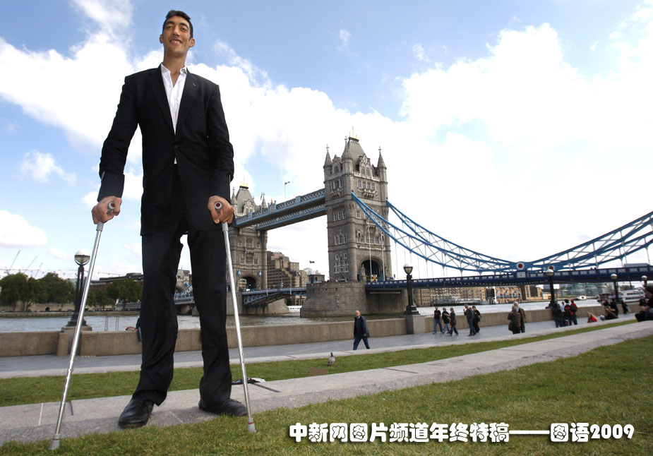 世界最高的人:9月16日,在英國倫敦泰晤士河傍的塔橋附近,身高2.46米的土耳其農民蘇丹·古錢加冕吉尼斯世界紀錄“世界最高人”桂冠。圖片來源:中國新聞網