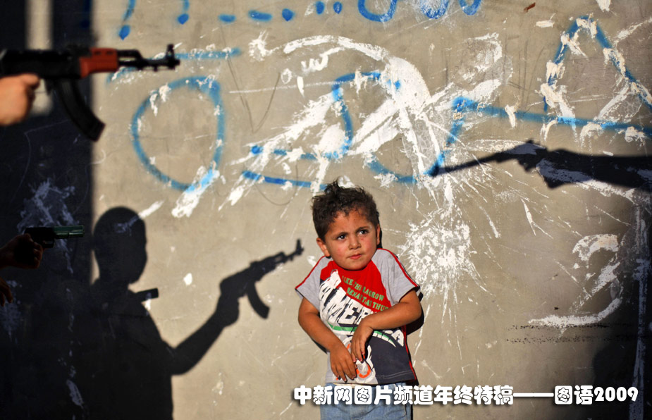 6月16日,一名巴勒斯坦男孩被幾名手拿玩具槍的青年包圍著。