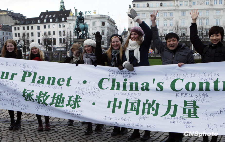 12月12日,正在丹麥哥本哈根召開的聯(lián)合國氣候會議舉行部分與會國會外會議,500多個來自70多個國家和組織的成員以及當?shù)丨h(huán)保者6萬多人匯集哥本哈根市貝拉會展中心進行大游行。圖為在哥本哈根環(huán)保大游行醒目的中國“環(huán)保先鋒行活動”。 中新社發(fā) 錢興強 攝
