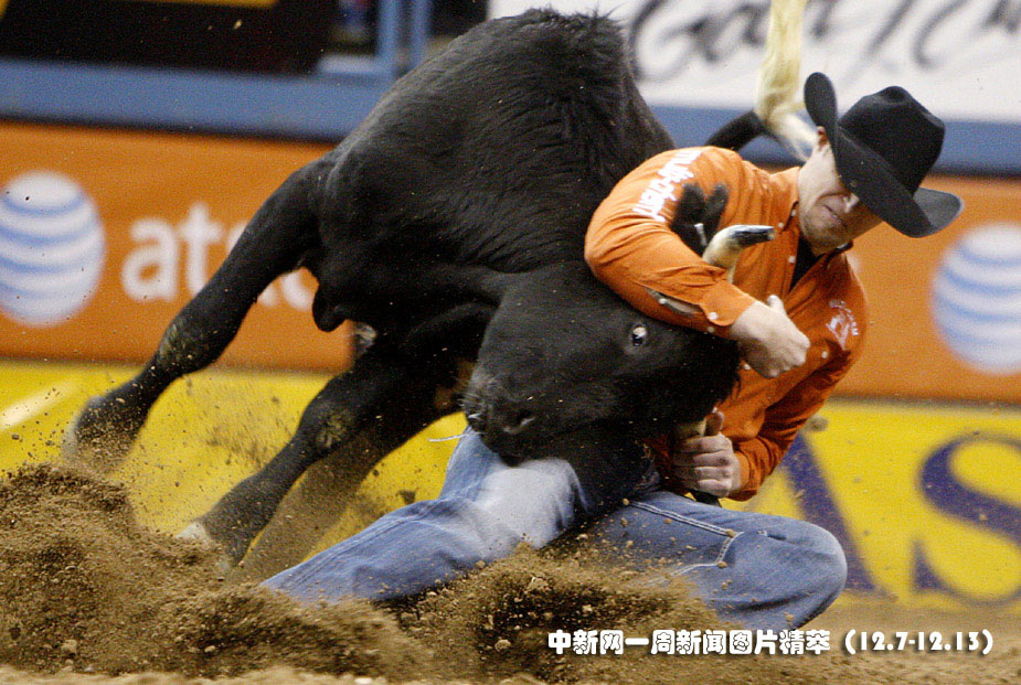 11日(周五),美國拉斯維加斯,一位全美斗牛競技好手正在與公牛“摔跤”。圖片來源:中國新聞網