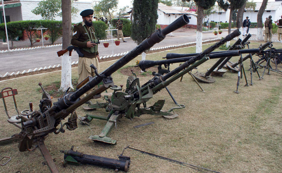 12月12日,在巴基斯坦西北部開伯爾部落地區,巴基斯坦軍方抓獲多名塔利班武裝分子,繳獲大量軍火。圖片來源:中國新聞網