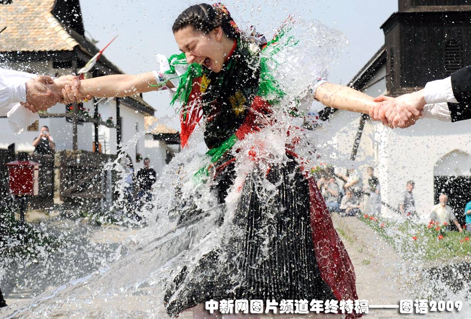 匈牙利迎接復(fù)活節(jié)“水潑美女”——4月9日,在布達(dá)佩斯東北部的一個(gè)小鎮(zhèn),當(dāng)?shù)鼐用裱菥毩藗鹘y(tǒng)舞蹈和潑水活動(dòng),身著傳統(tǒng)服裝的男孩向女孩們身上盡情潑水。