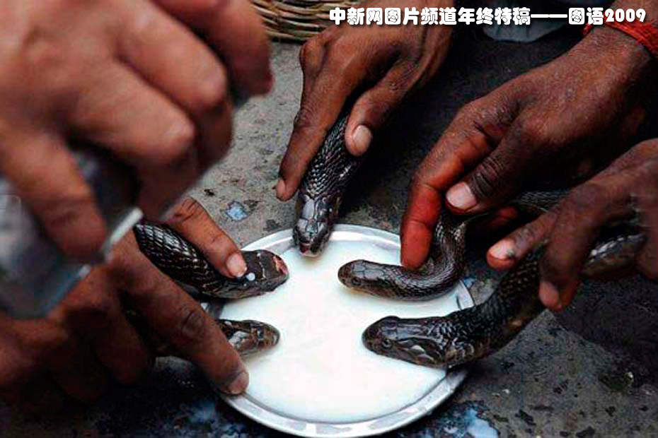 印度教“蛇節”眼鏡蛇洗牛奶浴——7月26日,印度北部城市阿姆利則一座印度教神廟內,耍蛇人將眼鏡蛇浸入牛奶中。當天是印度教傳統節日——蛇節(Nag-Panchami),眾多印度教徒紛紛前往寺廟進行膜拜。