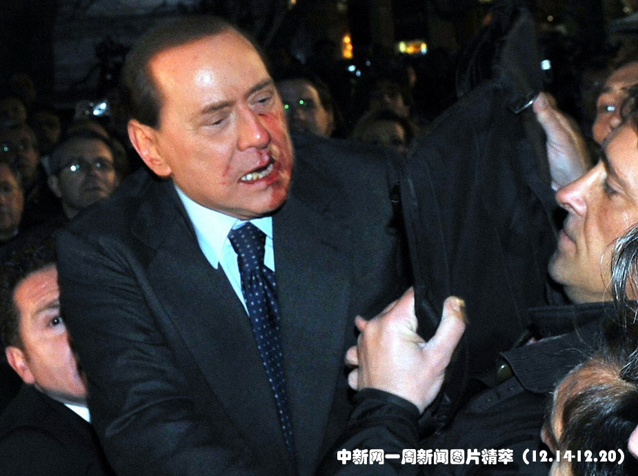 13日(周日)晚間,意大利總理貝盧斯科尼受邀在米蘭參加一個集會時遭到襲擊,面部受傷流血,隨后被緊急送醫(yī)治療。圖片來源:中國新聞網(wǎng)