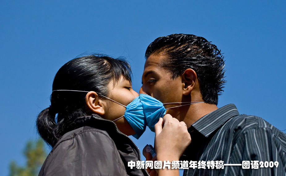 2009年4月29日,在甲型H1N1流感肆虐的墨西哥,一對情侶戴著口罩親吻。