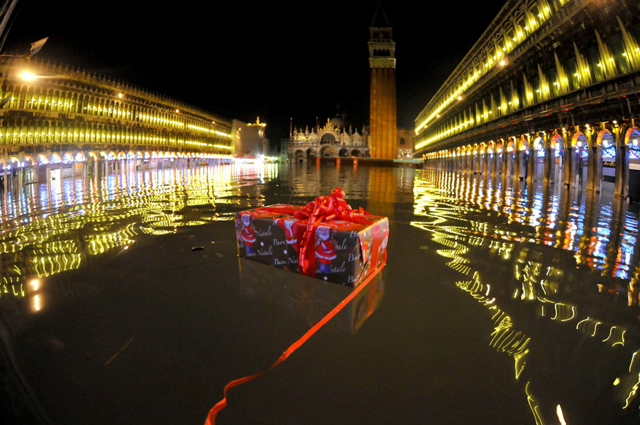 12月25日,意大利水城威尼斯圣馬可廣場被洪水浸泡。自從11月份以來,水城威尼斯受潮汐和一股強烈的熱帶風暴影響屢遭洪水“淹沒”。