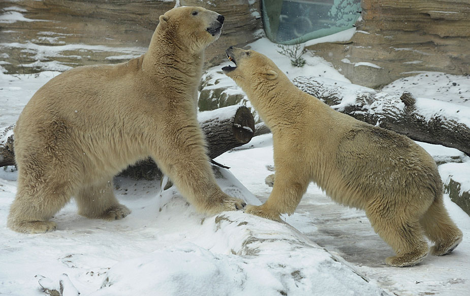 圖為12月30日,德國北部城市不來梅動物園的兩頭北極熊在冰天雪地中玩耍。