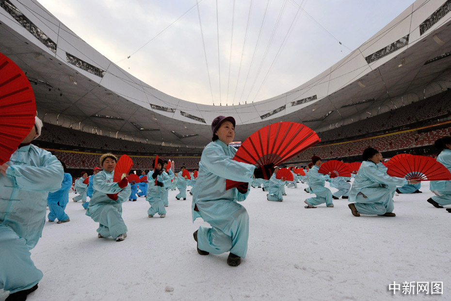 2010年1月1日上午,2010人在被冰雪覆蓋的鳥巢內表演了太極拳、武功扇等民族傳統健身項目。中新網記者 金碩 攝