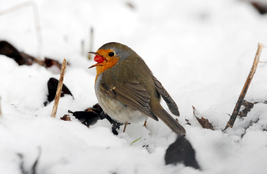 1月5日,德國,一只知更鳥正在吃著大餐欣賞雪景。