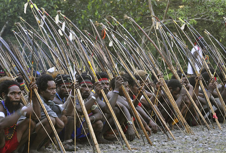 1月6日,印尼巴布省的兩個村落因債務問題引發了武裝爭斗,雙方手持弓箭等原始武器進行了一場原始的戰爭。目前,這場沖突已經造成多人傷亡。圖片來源:中國新聞網