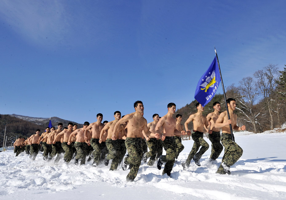 2010年1月8日,韓國特種部隊在首爾以東約180公里的雪地上進行了冬季實地演練,官兵們赤膊上陣鍛煉耐寒能力。圖片來源:中國新聞網