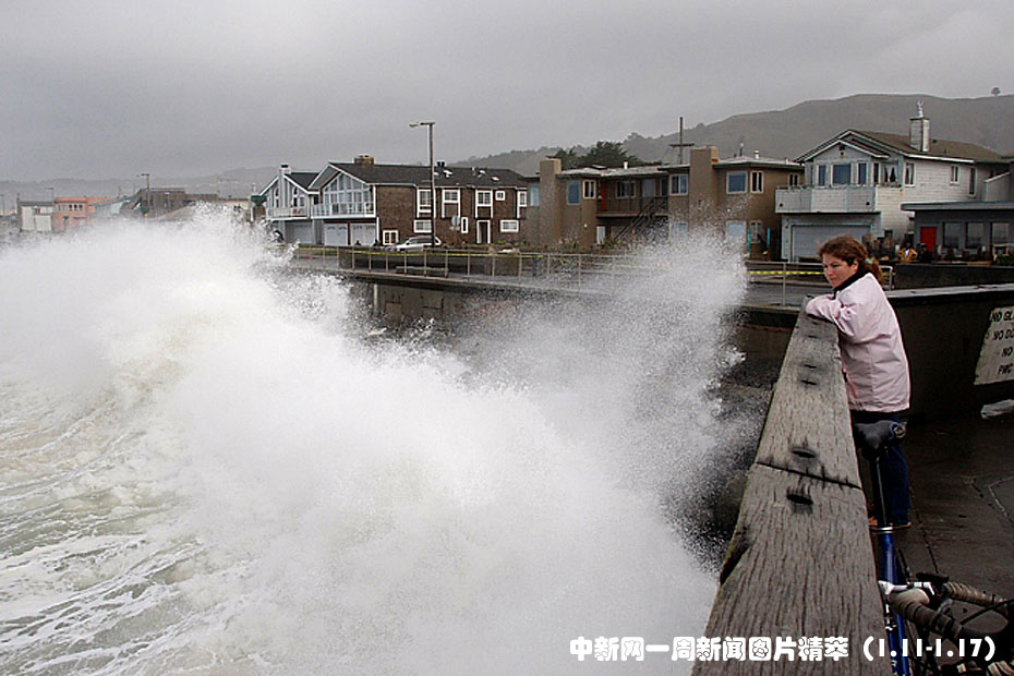 1月13日(周三),在加利福尼亞州帕西非卡,舒爾茨(Kim Schulz)看著巨浪拍打海堤。在加州北部和中部的一些地區,浪高超過20英尺。圖片來源:中國新聞網