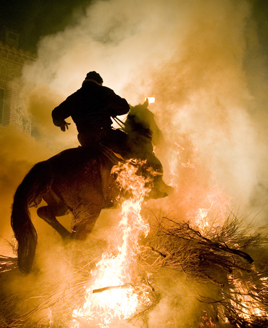 1月16日,西班牙一小村莊舉行一年一度的圣安東尼贖罪節,勇敢的騎士們騎上心愛的坐騎穿過熊熊燃燒的火堆。 圖片來源:中國新聞網