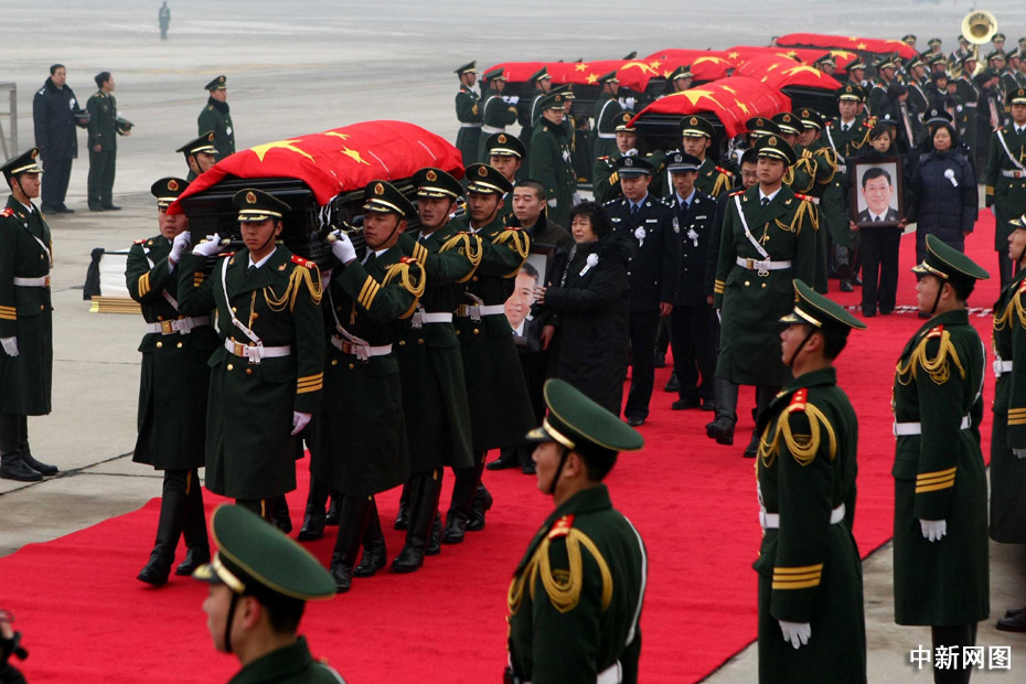 1月19日,禮兵護(hù)送八位烈士的靈柩,靈柩上覆蓋著中華人民共和國(guó)國(guó)旗。中新社記者 富田 攝