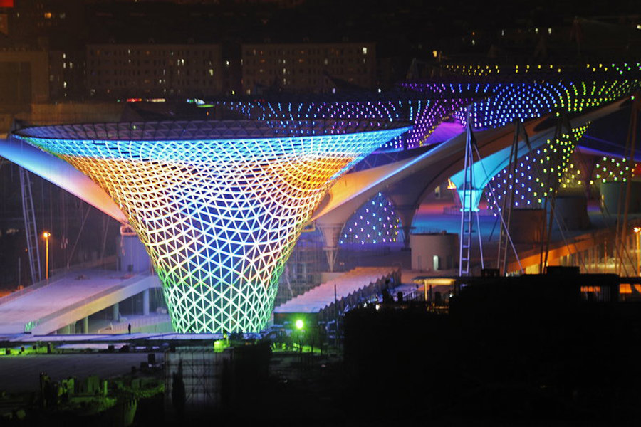 隨著世博腳步臨近,世博工地正熱火朝天的加快施工進(jìn)度,夜晚世博場館演繹燈光秀。郭長耀/CFP