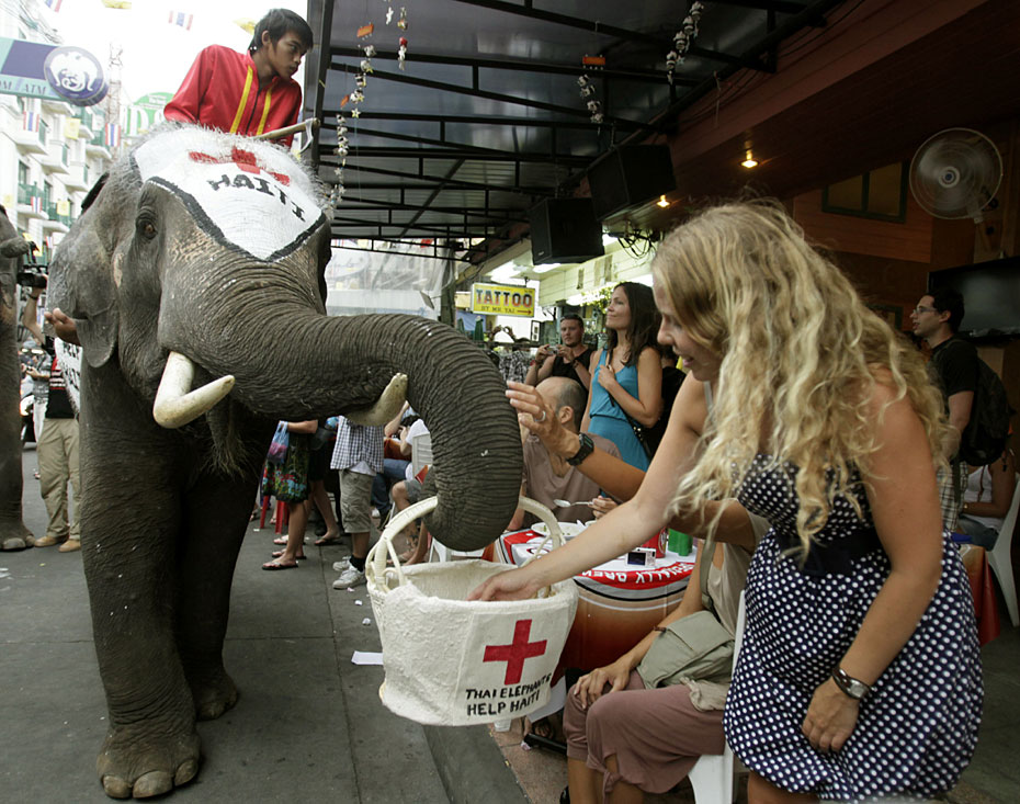 1月21日,在泰國首都曼谷舉辦了一場大象為海地災區募捐活動。人們紛紛向大象攜帶的籃子內放入善款,向海地地震幸存者獻上一份愛心。圖片來源:中國新聞網