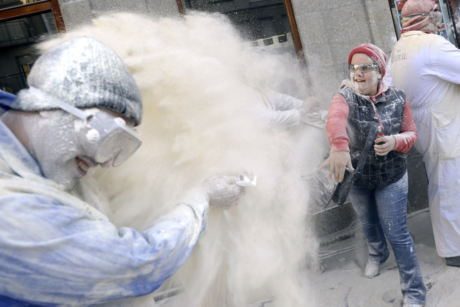1月24日,西班牙西北部的一座村莊舉辦的狂歡節中上演瘋狂的“面粉大戰”。圖片來源:中國新聞網