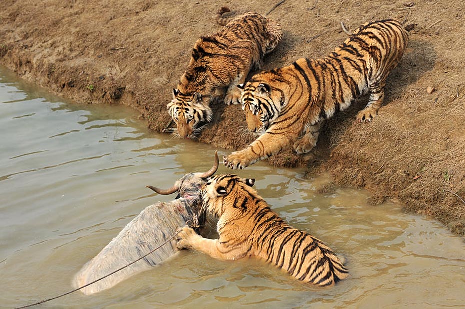 但水中的牦牛一動(dòng)彈,更加激發(fā)了老虎的野性,這時(shí)有三、四只老虎撲了上來,工作人員拼命往水塘邊上拽牦牛,無奈一只虎王一下就咬住了牦牛的脖子怎么都不肯松口,繼而上演了人和老虎的“拔河比賽”。