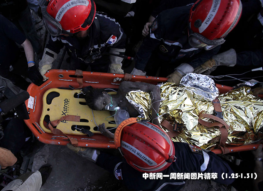 1月27日(周三),法國搜救隊從海地太子港的廢墟中救出一名少女,這名少女埋在廢墟中已超過兩周時間。圖片來源:中國新聞網