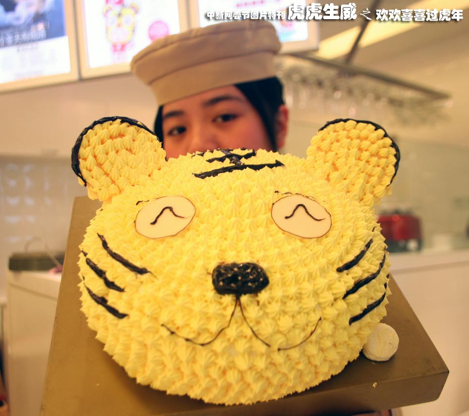 2月4日,浙江臺州市蛋糕店的點心師展示卡通虎臉蛋糕。中新社發(fā) 王天榮 攝