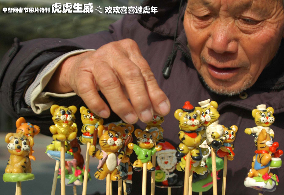 2009年12月5日,民間藝人孟爾珍在整理捏制的面“虎”。虎年即將來臨,74歲的江蘇揚州民間面塑藝人孟爾珍捏制出許多神態各異的面“虎”臨街售賣。這種由面粉、香油、蜂蜜、甘油等近十種配料做成的面“虎”,深受孩子和年輕人的喜愛。 中新社發 張丙濤 攝