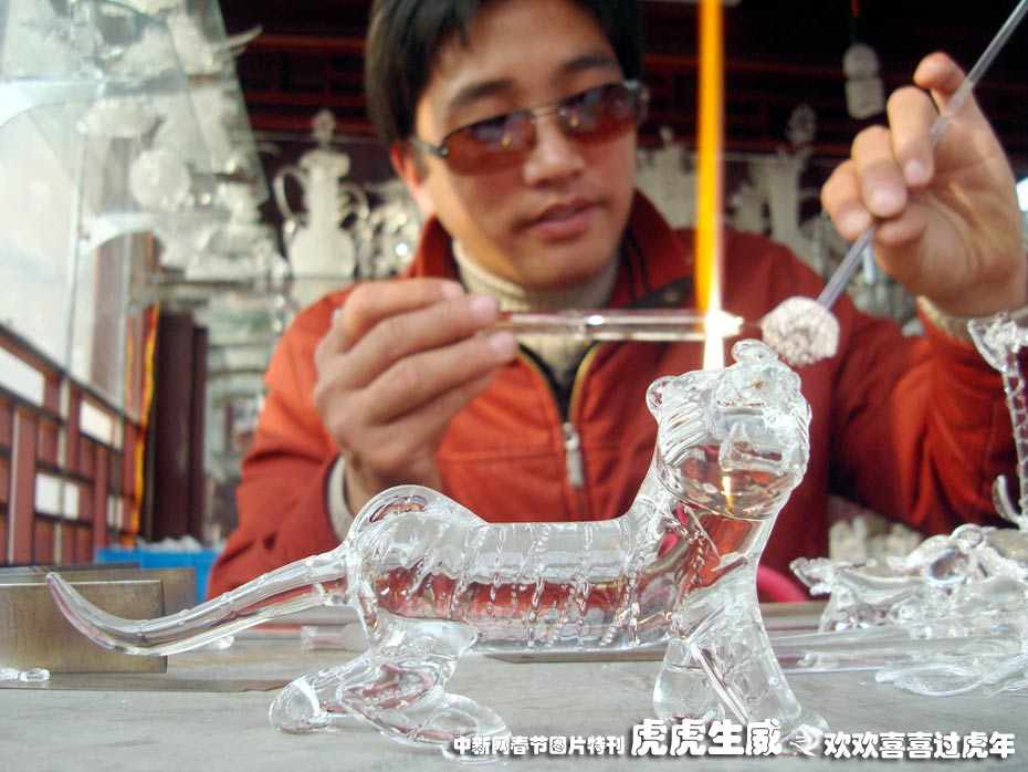 1月29日,蘇州市民間藝人馬強在工藝亭里利用玻璃拉絲絕技燒制而成的生肖虎飾品,造型逼真,吸引了眾多游人的目光。中新社發 王建康 攝