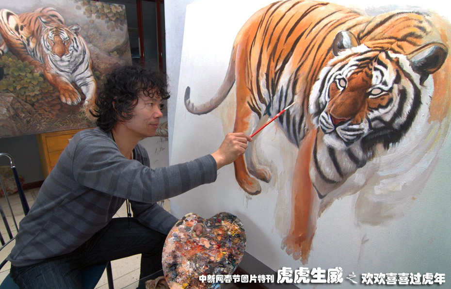 12月15日,遼寧省凌海市新莊子鄉(xiāng)禮中村的返鄉(xiāng)農(nóng)民工劉玉紅利用打工時(shí)學(xué)到的畫畫技藝,回鄉(xiāng)自主創(chuàng)業(yè)。他把中國畫傳統(tǒng)技法與油畫結(jié)合,創(chuàng)作一系列以“虎”為主題的作品,被不少國內(nèi)外美術(shù)愛好者收藏,成功實(shí)現(xiàn)再就業(yè)。中新社發(fā) 李鐵成jz 攝