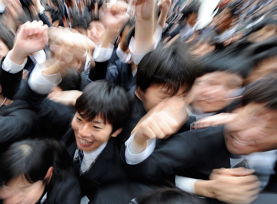 2月10日,日本東京職業學校的學生在求職動員會上伸出拳頭展現信心。日本的失業率達5%,2011屆畢業生將面臨嚴峻就業形式。圖片來源:中國新聞網