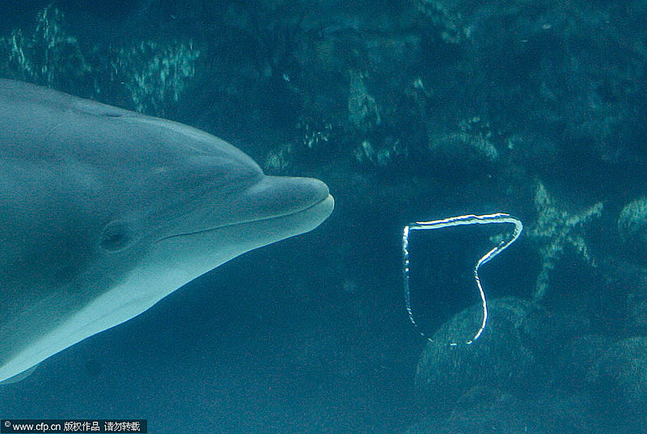 近日,美國奧蘭多海洋世界的一只寬吻海豚吹出“心形”氣泡,似乎要在情人節來臨前夕傳達濃濃愛意。圖片來源:CFP