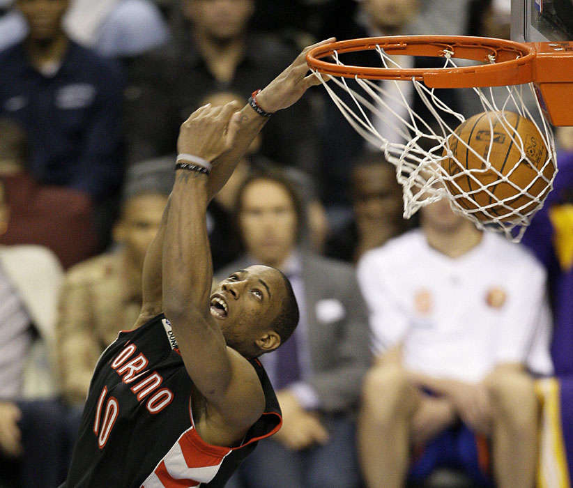 圖為多倫多猛龍隊的德羅贊進行扣籃表演。