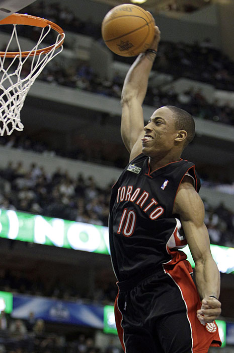 圖為多倫多猛龍隊的德羅贊進行扣籃表演。