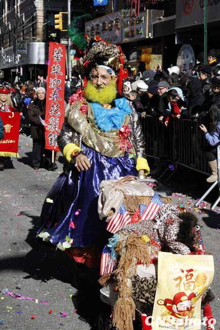 虎年紐約華埠慶祝農(nóng)歷新年“重頭戲”花車大游行21日登場(chǎng),吸引超過(guò)10萬(wàn)人圍觀共同狂歡,成為歷年來(lái)參加人數(shù)最多的一次花車游行。12輛盛裝花車以及數(shù)千人的表演團(tuán)隊(duì)沿著華埠最熱鬧的數(shù)十條街道一邊行進(jìn)一邊表演,滿天彩帶飄揚(yáng),場(chǎng)面熱鬧非常。圖為游行隊(duì)伍中奇裝異服的美國(guó)人。