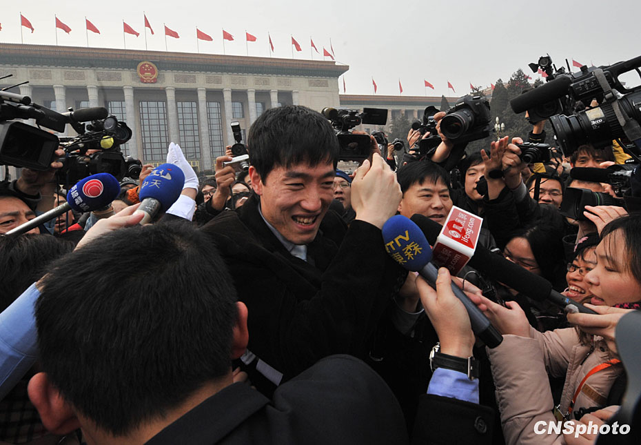 3月3日下午,政協委員劉翔出席全國政協十一屆三次會議開幕式,在北京人民大會堂外被媒體重重包圍,艱難脫身。中新社發 賈國榮 攝