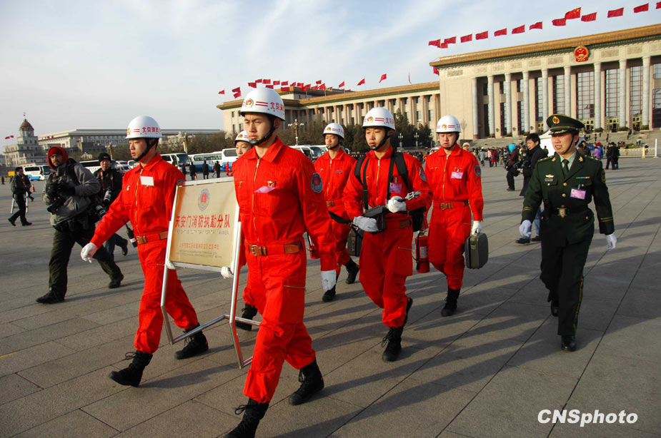 3月5日上午9時,十一屆全國人大三次會議在北京隆重開幕。國務院總理溫家寶作政府工作報告。圖為武警消防官兵提前進入天安門廣場,保障會議安全。中新社發(fā) 柯小軍 攝
